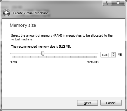 On choisit une taille de RAM “suffisante”. Ici 1.5Go pour 4Go sur la machine hôte.
