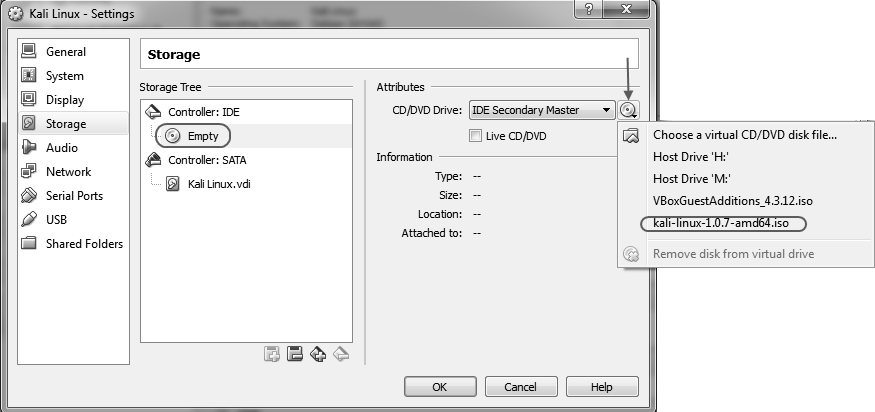 Puis on sélectionne “Controller:IDE” –> “Empty” et on clique sur l'image du CD à droite